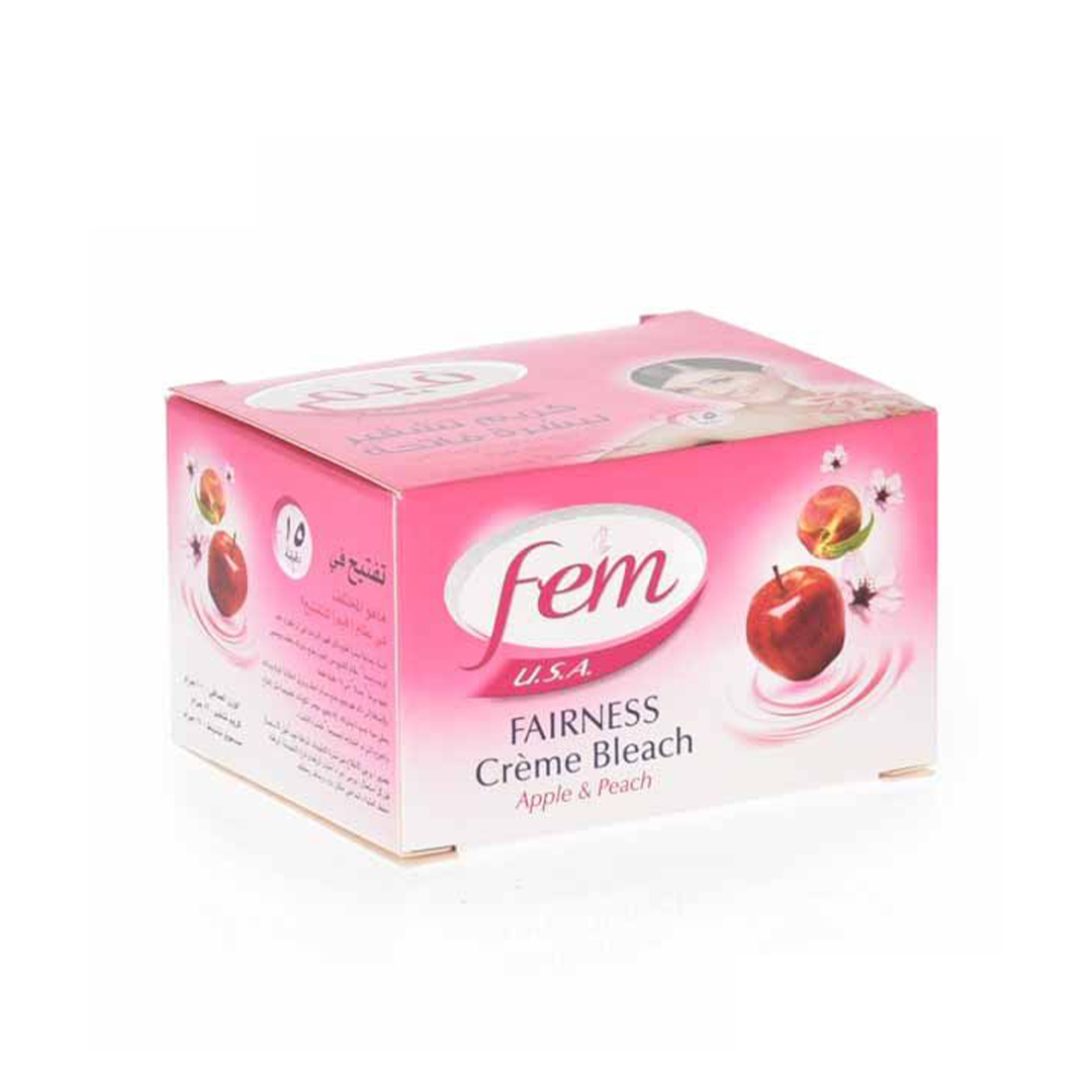 Fem Fairness Creme Bleach Apple & Peach 100g is a fruit-based fairness bleach that lightens facial hair and evens out skin tone. Infused with the goodness of apple and peach extracts, this bleach also nourishes and revitalizes the skin, leaving it soft, smooth, and glowing. Suitable for all skin types, it's gentle on the skin while delivering effective brightening results.