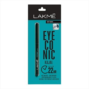 Lakme Eyeconic Kajal delivers intense black color in just one stroke. Its smudge-proof, waterproof formula ensures it stays on for up to 24 hours, making your eyes pop.
